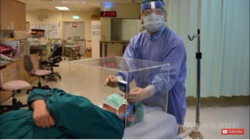 “La caja protectora fabricada en acrílico creada para proteger al personal médico de posibles contagios por COVID-19 durante el proceso de intubación. Mantiene la parte superior del paciente dentro del cubo dejando hombros y cabeza en la zona de seguridad, al tener la parte infecciosa dentro del zona de seguridad permite a los médicos, por medio de dos orificios en una de las paredes del cubo protector, manipular la cabeza del paciente para la intubación endotraqueal.”
